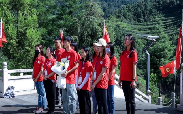 随后,实践团全体师生跟随讲解员来到纪念塔后方的红军烈士墓前开展集体祭奠活动。谭旭明同学代表全团向壮烈牺牲的红军烈士献花,在庄严的烈士墓前,全体成员神情肃穆、垂手站立,默哀一分钟并行三鞠躬礼,深切缅怀烈士的光辉事迹,追思他们不怕牺牲、无私奉献、英勇顽强的崇高革命精神。
