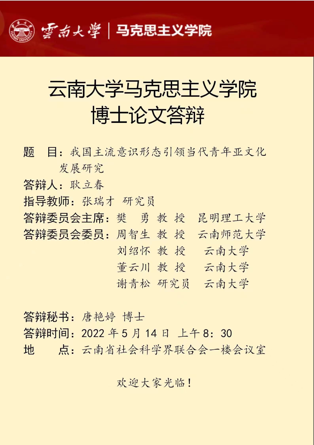 2022年5月14日上午,333体育博士论文答辩在云南省社会科学界联合会一楼会议室举行,答辩人分别为耿立春、曾金燕、韦玲,欢迎感兴趣的师生前往参加,具体答辩时间见下图: