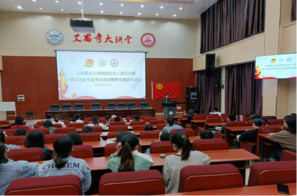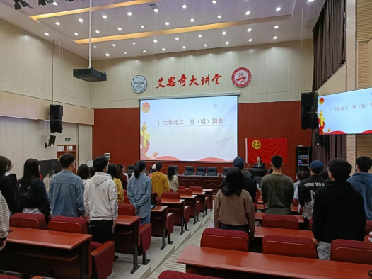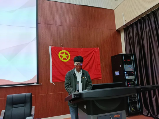 在全体起立奏唱国歌后,2021级硕士研究生靳澄宇同学宣布新团员名单,并带领新团员2021级硕士研究生高民浩同学面向团旗,庄严宣读入团誓词。2021级硕士研究生夏欣同学作为新团员的入团介绍人,向全体团员宣读《团章》中团员的义务和权利。