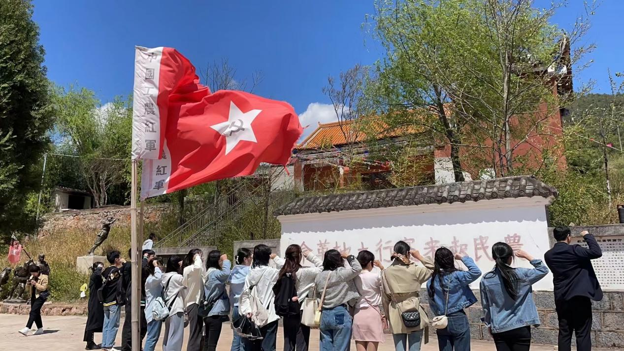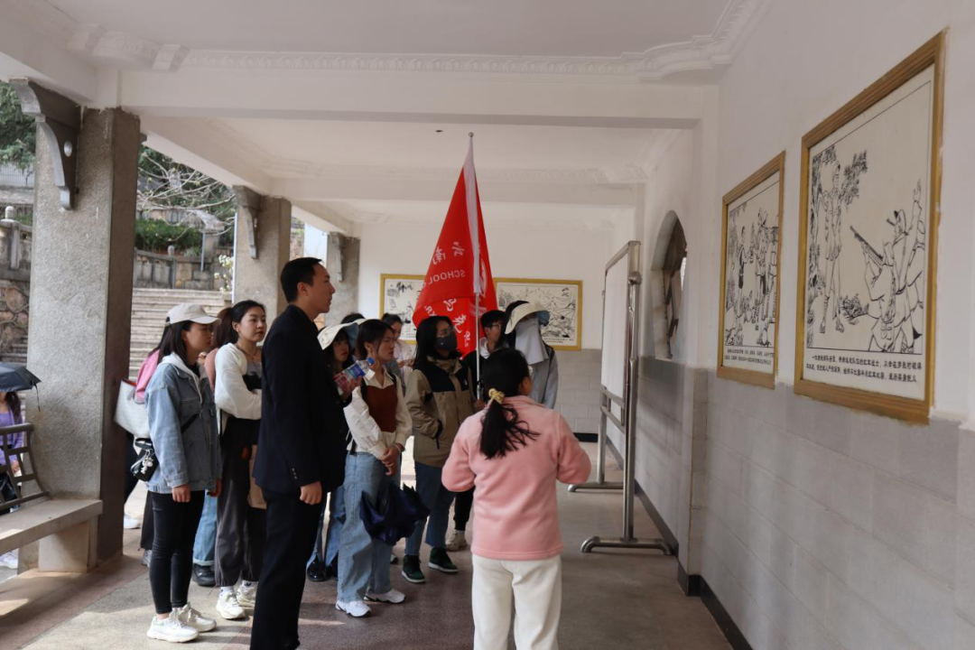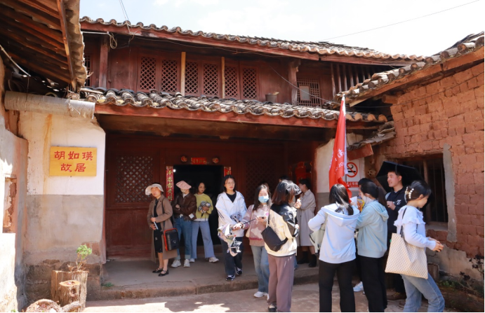 首先,同学们来到昆明市嵩明县东村社区红色教育基地,在讲解员的带领下,同学们深入了解东村社区的红色故事。1935年4月,红军长征经过嵩明县,并沿路宣传党的革命思想,在东村龙王庙留下了宣传标语,对嵩明革命发展产生了深刻的影响。在红军转移之后,东村的胡如瑛等革命先烈带领“嵩寻游击大队”为嵩明乃至云南的解放做出了积极贡献。