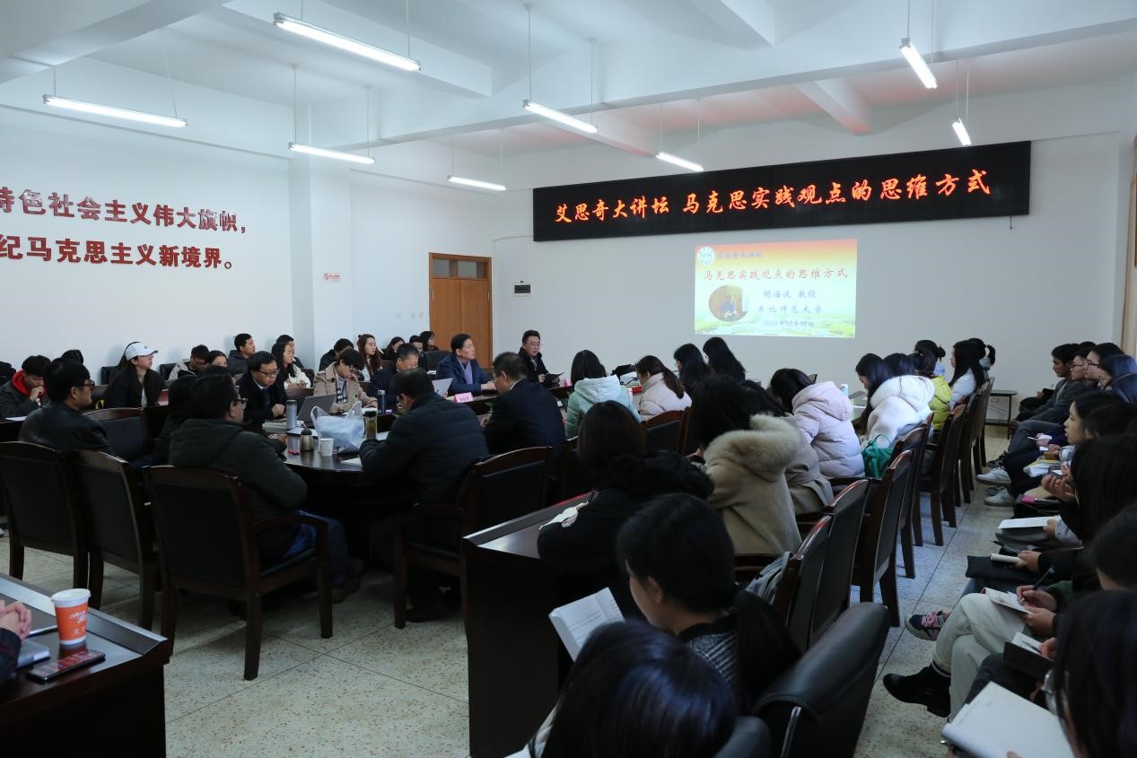 2019年12月10日上午,333体育官网“艾思奇大讲堂”举行了“马克思实践观点的思维方式”专题讲座,本次讲座由333体育、333体育官网社科处共同主办。主讲嘉宾为东北师范大学马克思主义学部哲学院教授、博士生导师、国务院政府特殊津贴获得者、全国价值哲学研究会副会长、吉林省哲学学会副理事长胡海波教授。第一阶段的学术讲座由333体育经理李兵主持,公司党政班子成员和学院全体师生、云南省高校“手拉手”第一组共建单位部分老师共70余人参加了学术讲座。
